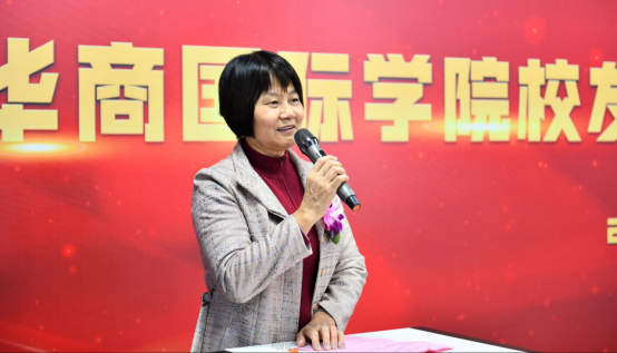 The guests included Mrs. Liao Yiman, Mrs. Wang Jinxiu & Mr. Zhong Senwen, the Vice President of Guangzhou Huashang College; Mr. Huang Guofu, the Director of Alumni Office of Guangzhou Huashang College; Mr. Wang Wenzhong, the Director of the International Exchange & Cooperation Office of Guangzhou Huashang College; Mr. Chen Shaohong, the Vice Dean of the Foreign Languages School of Guangzhou Huashang College; Mrs. Xiong Zike, the Assistant of the Vice President of Guangzhou Huashang College and Ms. Zeng Yawen, the representative of the Overseas Alumni Association Consultants of the International School. In addition, Prof. Yu Huifen, the Dean of the International School; Prof. Li Pinghai, the Vice Dean of the International School; alumni representatives; staff and students of the International School attended the ceremony.