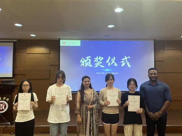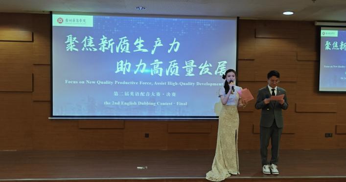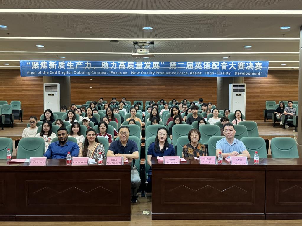 General Secretary Xi Jinping emphasized during the 11th collective study session of the Political Bureau of the Communist Party of China Central Committee the need to accelerate the development of new quality productive forces and solidly promote high-quality development. In order to help college students understand the connotation, development, and influence of new quality productivity, tell the story of China's development of new quality productivity in English. Since April 2024, the International College of Guangzhou Huashang College, in conjunction with the International Exchange and Cooperation Office, has organized the second English dubbing competition“Focus on New Quality Productive Force, Assist High-Quality Development”. Through the preparation of dubbing videos by contestants and preliminary selection, the final was held on May 28, 2024 in the Academic Lecture Hall of the Guangzhou Campus Library. Wang Wenzhong, Director of the International Exchange and Cooperation Department, Hui Yanyan, Dean of the International School, Du Xiujun, Vice Dean of Foreign Languagesthe School of , Yang Lijun, Secretary of the Party Branch of the International College, Dr. Frank Larbi, a Ghanaian teacher, Dr. Aneela Qadir, a Pakistani teacher, and more than 120 college students from the InternationalSchool, Foreign LanguagesSchool , LiteratureSchool, Health and MedicineSchool ,Management School , Artificial IntelligenceSchool , Economics and TradeSchool , andTeacher Education School attended the finals on site.