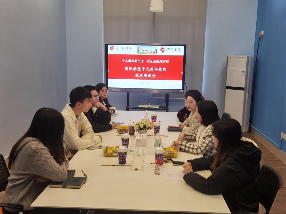 Guangzhou Huashang College (formerly Guangdong University of Finance & Economics Huashang College) celebrated its 19th anniversary on December 26, 2024. To strengthen the emotional bonds between alumni and their alma mater, leverage alumni resources, and promote the sustainable development of the International School Alumni Association, the International School invited past alumni back to campus for a reunion and development discussion in celebration of this milestone.