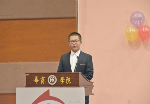 Mr Hu Bairong, the freshman representative, making a speech