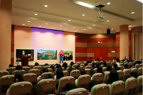 During the speech, Mr. Yang lectured mainly from three series of works: Footprints-From Liangjiahe to Zhongnanhai, Move Toward Rejuvenation, and Chinese Heart. Some of the paintings demonstrate crucial historic moments recording the Chinese revolutionists’ struggle for national rejuvenation. From the informative and thought-provoking paintings, the audience understood the immortality of the revolutionary heroes and cherish the happy life nowadays. With patriotism and persistence, Mr. Yang stepped on the Yangtze River, the Yellow River and the Great Wall alone to capture the spectacular landscape, created these photographs into other silk paintings. He is dedicated to spreading these paintings throughout the world to help foreigners appreciate Chinese picaresque landscape and enhance the cultural confidence and patriotism of the Chinese people. Mr. Yang illustrated these scrolls emotionally and interacted with the audience actively.