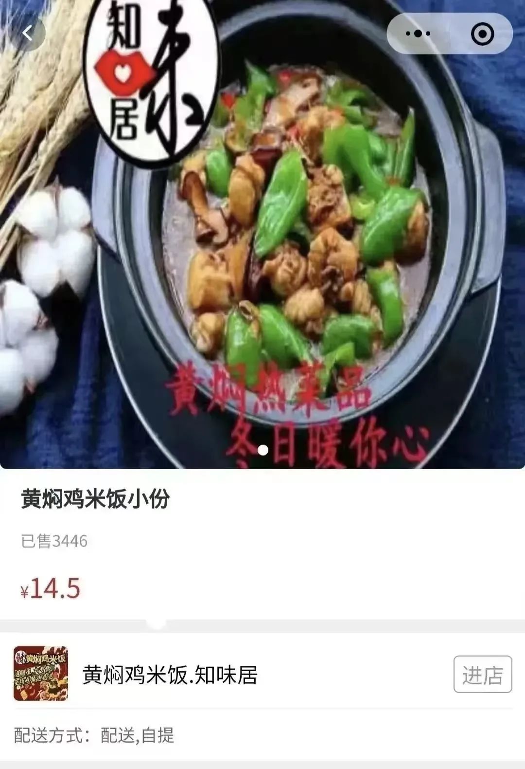 2、进入店铺选择喜欢的菜品(如“黄焖鸡米饭”)--加入购物车--结算。