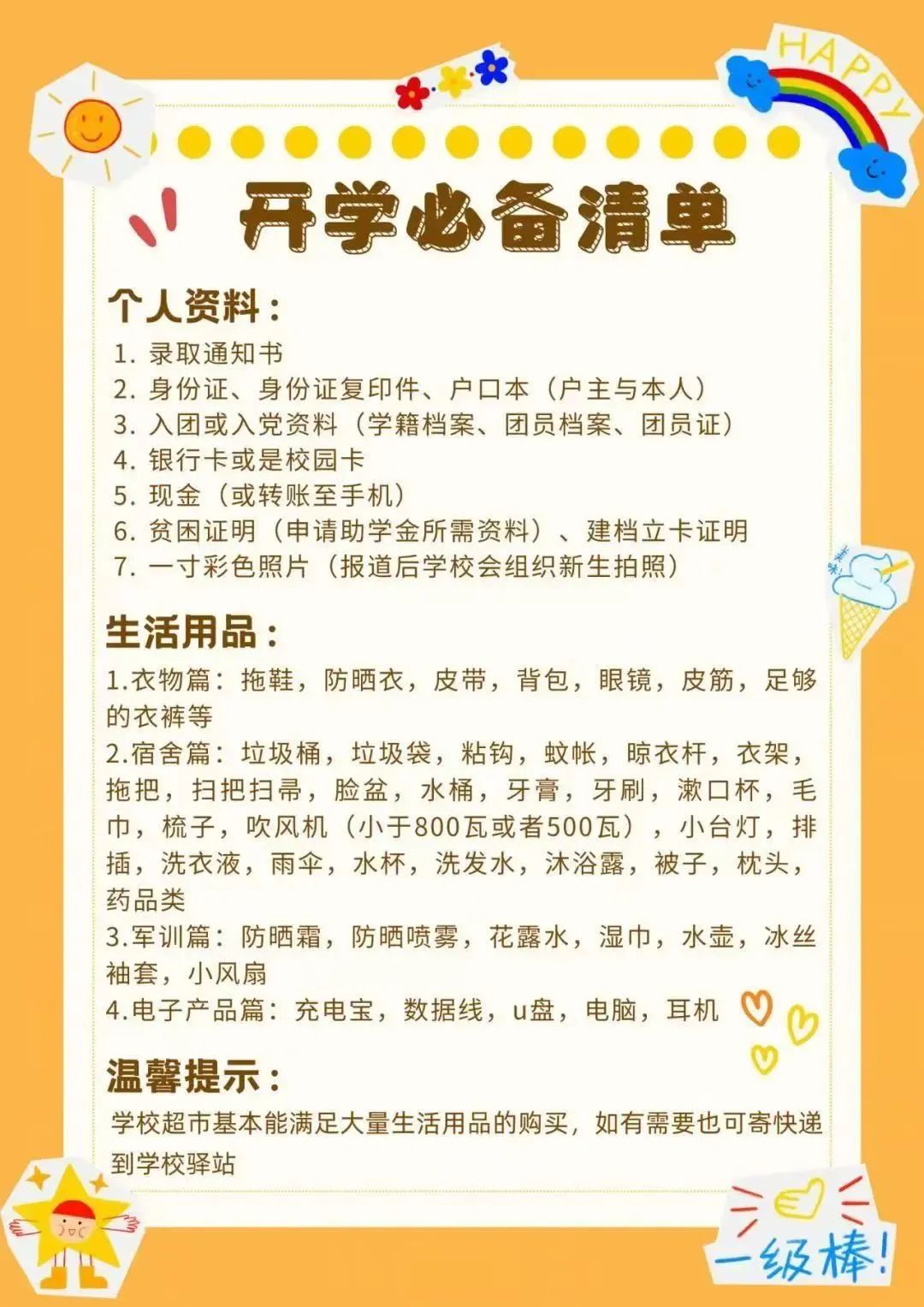 建议新生们不要携带大量现金到校,可以将开学生活用品的费用预存在微信或者支付宝上,校内的商店和超市都可以使用手机支付,十分便利。同时也要注意自身财产安全。