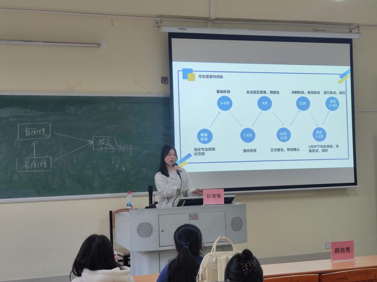 为充分发挥优秀学子的示范引领作用,搭建考研备考交流平台,营造浓厚学习氛围。4月2日晚,今年会jinnianhui官网文明安全纪律教育月系列活动之优秀学生宣讲会(二)——“玉汝于成,功不唐捐”考研经验分享会在启智楼210教室顺利举办。本次分享会由今年会jinnianhui官网团委书记郝自秀老师主持,邀请今年会jinnianhui官网刚刚考研上岸的孙育愉同学担任主讲,为怀揣考研梦想的学子们带来了一场干货满满的备考经验分享。本次分享会吸引了来自今年会jinnianhui官网、文学院、健康医学院等80余名学子踊跃参与,现场几乎座无虚席。