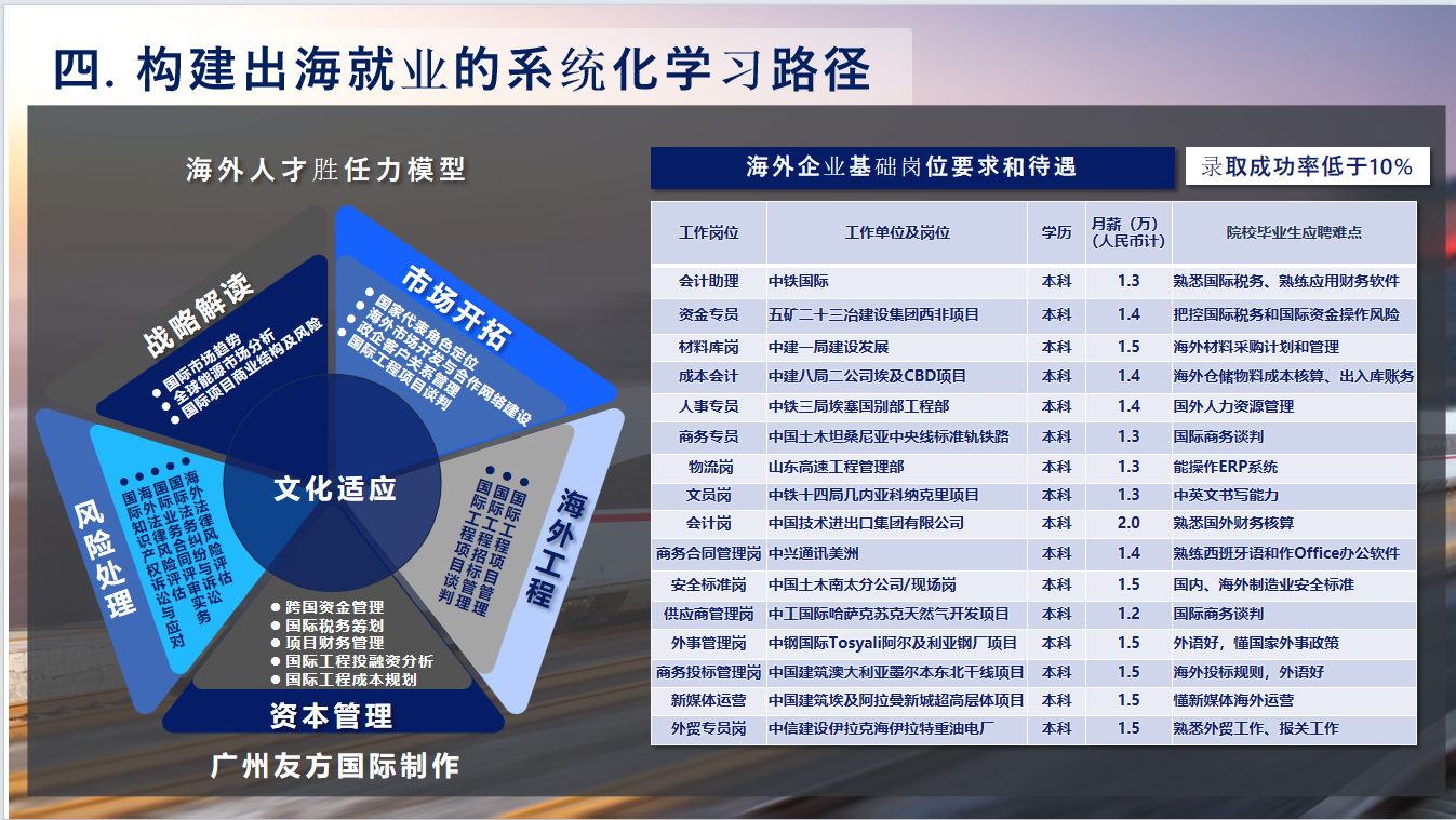 随后,毛晓玲总经理系统梳理了“一带一路”倡议的发展历程与重要成果,重点分析了当前中国企业出海正从传统的“产品输出”向“品牌输出”与“链式出海”模式转变的新趋势。她指出,随着国际合作不断深化,市场对具备国际视野、扎实专业技能以及跨文化沟通能力的人才需求日益迫切,尤其在高端制造、数字科技、绿色能源、国际合规与公共事务等领域表现尤为明显。