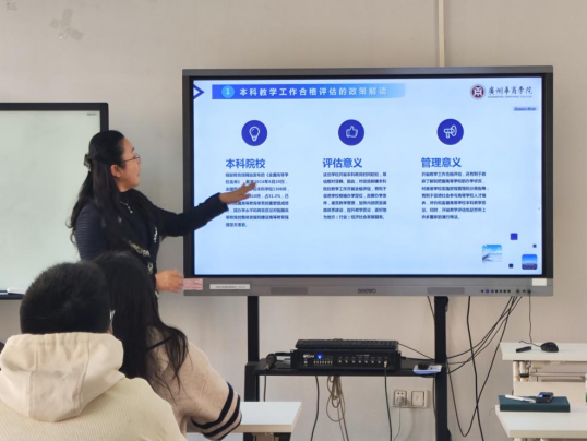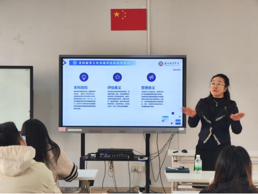 回雁雁院长讲解了本科合格评估的具体指标体系与操作流程,强调合格评估的7个一级指标,20个二级指标以及40个观测点都是本科合格评估的重要的一环。特别是在办学定位、教学中心地位、人才培养、师资队伍、专业与课程建设、学风建设以及教学质量方面,学校尤为重视。解读完毕后,大家一致认为,评估工作将对学院的教学质量提升起到积极推动作用,并表示将全力支持各项工作落实。