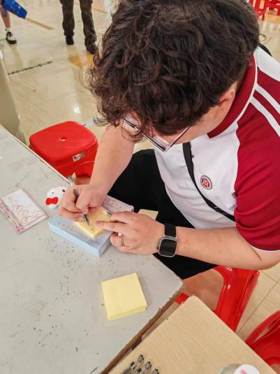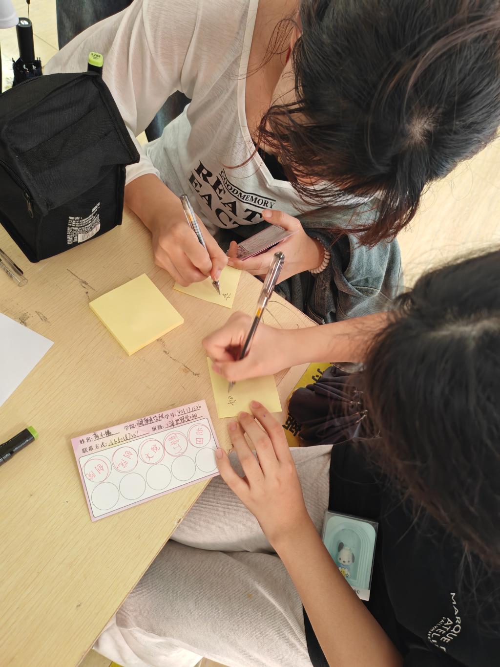 在“心灵树洞”游戏部分,设置了烦恼寄存与暖心寄语双重互动环节。同学们通过匿名便签写下近期困扰,贴至“烦恼黑板”完成情绪释放;随后,大家从寄语箱中抽取陌生人的暖心留言,在治愈文字中收获慰藉。同学们针对黑板上的烦恼留言进行回复,以“树洞对话”的形式构建起了陌生人之间的情感联结,让善意在双向互动中持续流动。