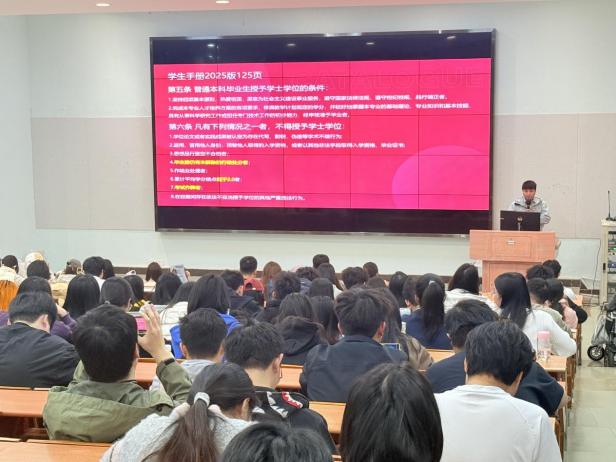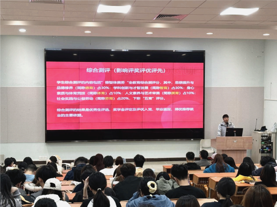 为让学生清晰掌握综合测评规则,助力评奖评优与全面发展,会议对“德智体美劳”五育并举的综合测评体系进行了详细解读。通过细致拆解评分标准,学生进一步明确了“五育并举”的发展方向,知晓如何通过参与各类活动、提升学业成绩来丰富个人综合测评档案。