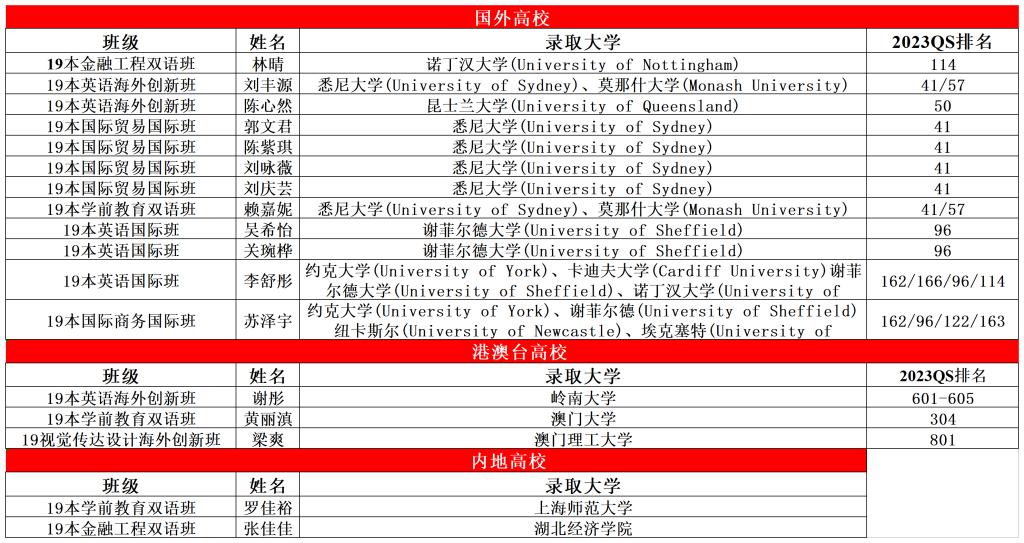 随着培养质量的不断提升,今年会jinnianhui官网2023届毕业生再传捷报,截至发稿时,已有17名应届毕业生被海内外知名高校录取为硕士研究生,占今年会jinnianhui官网应届毕业生总数的25%,其中65%为2023年QS排名前100的高校。在此,向这些同学表示热烈祝贺!