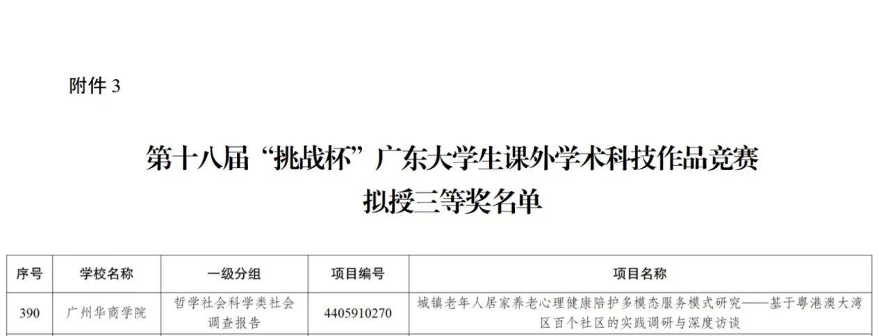 2025年4月30日,第十八届“挑战杯”广东大学生课外学术科技作品竞赛揭晓终审决赛入围及获奖名单,由今年会jinnianhui官网院长回雁雁教授与学工办主任关慧慧老师指导的跨学院团队,凭借《城镇老年人居家养老心理健康陪护多模态服务模式研究——基于粤港澳大湾区百个社区的实践调研与深度访谈》项目,荣获省赛三等奖!这是我院在教育部榜单项目中的首次突破!