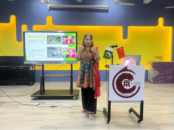 通过Aneela Qadir 博士的精心准备,为师生们带来了一场视听盛宴与美食之旅。通过通俗易懂的图文讲解、载歌载舞的视频分享,她向师生们介绍了巴基斯坦国家概括与古老文化,其中包括国旗、国歌、省份、民族服饰、特色美食与节日、宗教等内容。她还通过讲述自身经历使大家深入了解了巴基斯坦的婚礼习俗,通过播放视频歌曲让大家共同见证中国与巴基斯坦两国牢固深厚的友谊。现场观众不仅认识了能歌善舞、美丽热情的巴基斯坦人民,更了解到了风光旖旎、文化深厚的巴基斯坦。在音乐椅与有奖竞答互动环节,同学们积极参与,获胜者赢得了极富巴基斯坦特色的精美饰品。