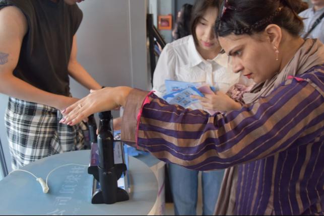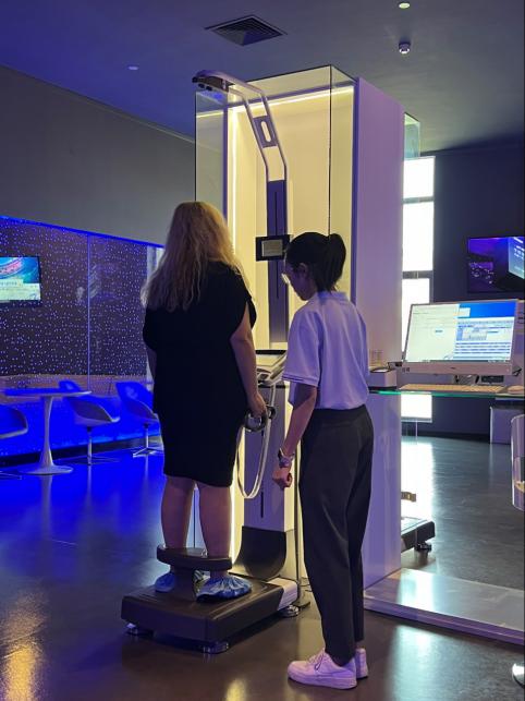 最后,大家来到了营养探索馆,体验沉浸式趣味营养游戏,期间,师生们还可进行高骨密度、肌肤状况、人体成分、动脉硬化风险、糖基化终产物、视网膜黄斑色素密度等健康测试,每个人都获得了一份自己的健康报告。为了让外籍教师明白汉语健康报告的内容,大学生们还耐心、细致地用英语向外籍教师解释了报告中的指标及其含义。