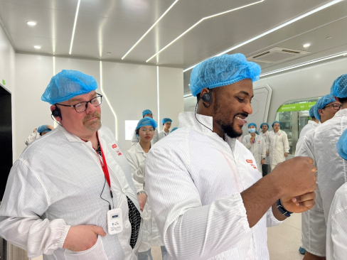 接着,所有人穿上了防尘装备进入透明工厂的生产车间,深入了解口服固体片剂大规模连续生产和蛋白粉灌装无菌化连续生产过程。对于工厂的无尘生产环境、无人全自动设备的普及、精准的质量和数量控制,师生们不禁感叹新质生产力对工业的影响之巨大。