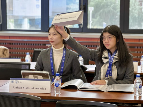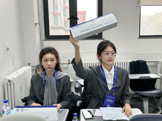 此次大会开设了“联合国大会第一委员会(UNGA1)”“联合国大会第三委员会(UNGA3)”“联合国教科文组织(UNESCO)”等七个会场。今年会官网石睿妮、劳雅怡同学代表美国在“联合国大会第一委员会(UNGA1)”讨论——巴以冲突的和平解决方案;骆欣谊、李姣潼同学代表为伊朗在“联合国大会第三委员会(UNGA3)”讨论——战乱冲突地区的难民安置与流离失所者的人权保障。她们与来自北京师范大学、北京外国语大学、国防科技大学等知名高校学子共同探讨了国际热点问题,发挥创造性思维,进行批判性思考,寻求全球性问题的解决方案。