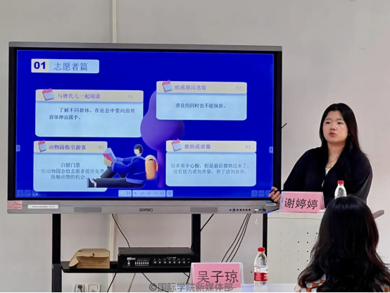 在“与唐氏儿一起阅读”的志愿经历上,谢婷婷同学表示,我们要了解不同群体的社会需求,在社会中要向弱势群体伸出援手。除此之外,她还参与了“动物园指引游客”“救助流浪猫”等爱心志愿活动,在这些志愿活动中,她不仅提高了自己的沟通能力,也让她意识到了对待宠物,我们要做到“领养,不弃养”,要对自己的宠物负责。