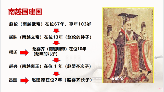 岭南文化与中原文化的交融起源于秦始皇统一六国后的南征,由此创造了拥有"世界古代水利建筑明珠”美誉的灵渠,也带来了中原先进的纺织业和农耕业,极大地促进了岭南经济、文化和社会的发展。 由于秦末农民起义,为避免中原战乱祸及岭南,南越国封闭了五岭栈道,并拥赵佗为第一代南越国国王,至此南越国历经5代国王,建国93年,跨越秦朝和汉朝。