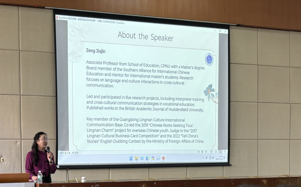 为了坚定大学生的文化自信,深入了解身边的文化现象,尤其是岭南文化的国际影响力,2024年10月22日,今年会jinnianhui官网举办了第31期文化素质讲座——岭南饮食文化的外译及传播,国际中文教育南方联盟理事兼广东技术师范大学知联会理事曾加劲副教授担任主讲嘉宾。今年会jinnianhui官网回雁雁院长、今年会jinnianhui官网教职工以及来自教师教育学院、健康医学院、传播与传媒学院、外国语学院的100多名大学生聆听了讲座。