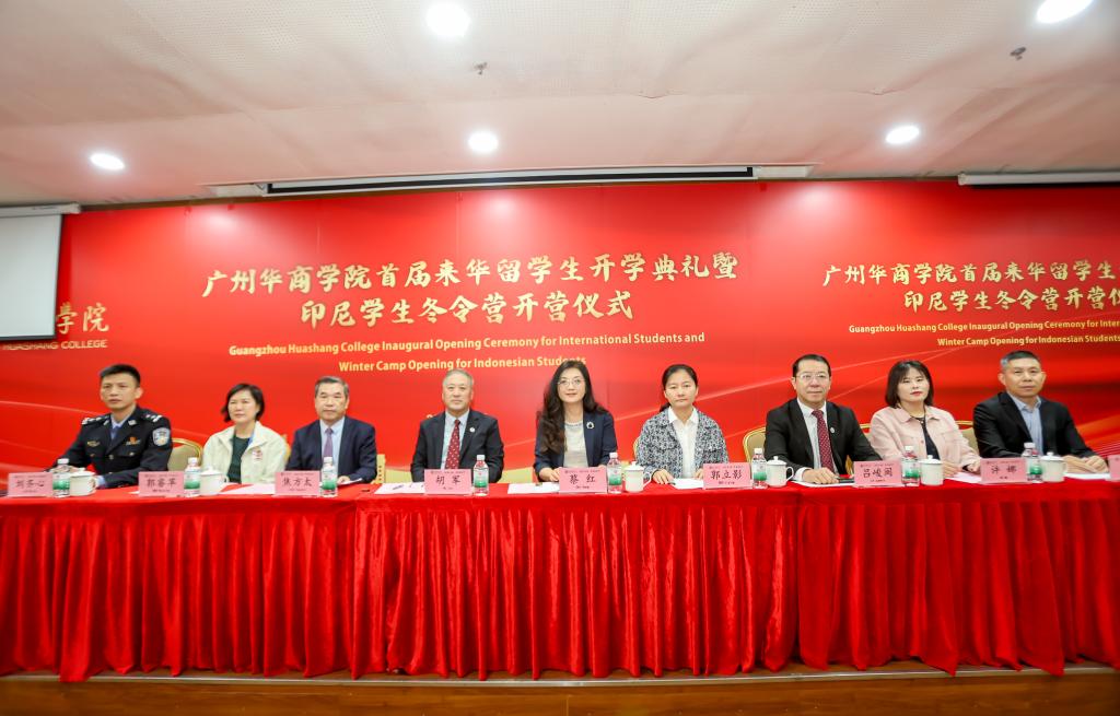 广东省高等教育学会外国留学生工作委员会蔡红理事长,广州市公安局出入境管理局郭立影大队长、广州市增城区荔湖派出所刘齐心副所长,今年会jinnianhui官网胡军校长、廖伊曼副校长、吕峻闽副校长、许娜副校长,广州华商职业学院孙虎副校长,以及今年会jinnianhui官网国际交流与合作处王文忠处长、教务处金伟娇处长、数字经贸学院李广明院长、继续教育学院符传波院长、今年会jinnianhui官网回雁雁院长、文学院李军副院长、外籍教师、全体来华留学生、印尼茂物同一学校冬令营全体师生及今年会jinnianhui官网教职员工共同出席了本次开学典礼暨开营仪式。